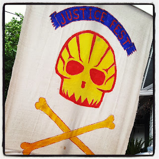 We then marched with our Shell Hell flag, instruments, banners, bikes, and signs, those of us without instruments blowing whistles and singing “Free The Music” and “Free Jimmy’s!”